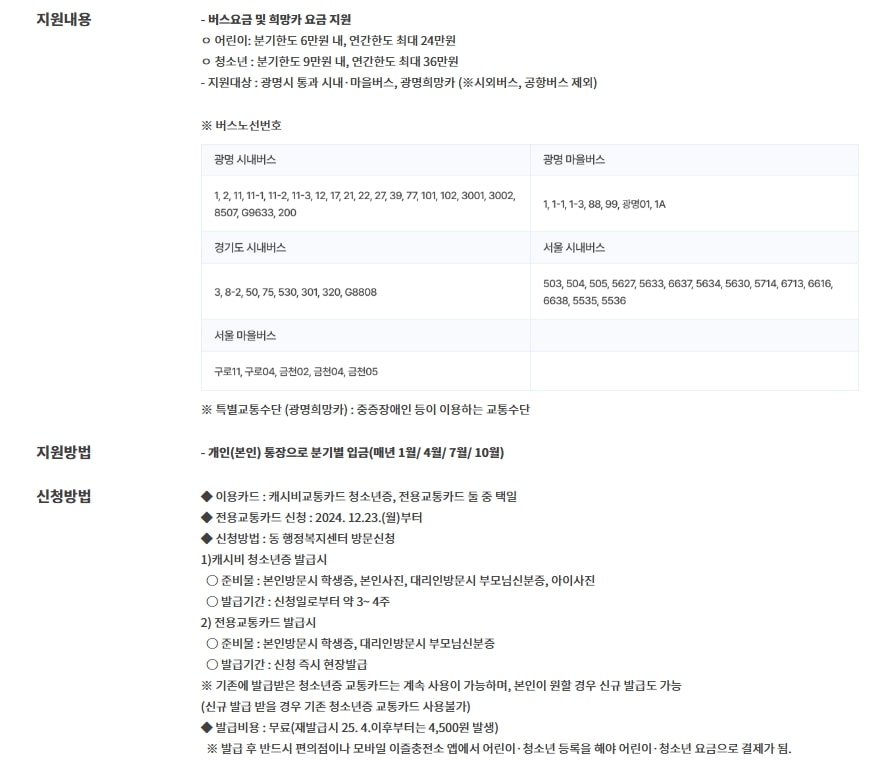 • 어린이와 청소년의 교통비 지원 한도는 각각 연간 24만원 및 36만원으로, 지원 교통수단은 광명시를 통과하는 특정 버스만 포함된다.