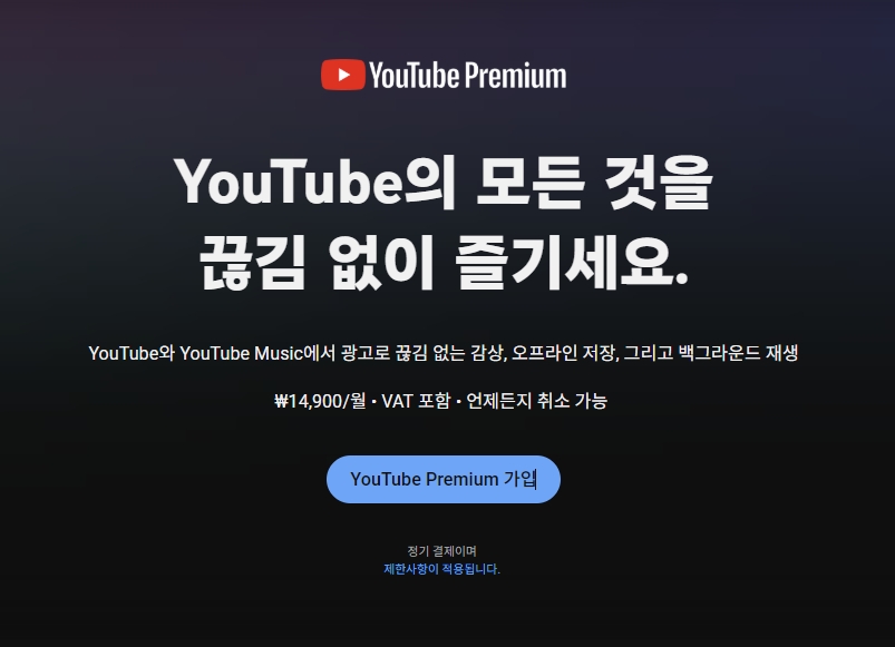 유튜브 프리미엄은 월 14,900원의 요금이 발생합니다.